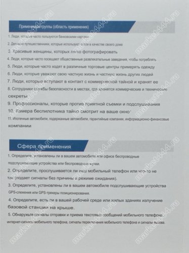 Возможные места для использования прибора. | Ванные, раздевалки, казино, квартиры, помещения для проведения важных переговоров, экзаменов, семинаров, транспортные средства. |