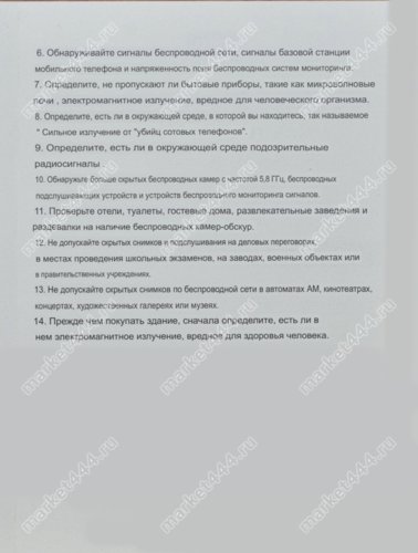 Режимы работы, поиска | 1) Электромагнитному излучению. 2) Магнитному полю. 3) Визуальный поиск скрытых микро видеокамер при ИК. 4) Фонарик. 5) Противоугонная сигнализация. |